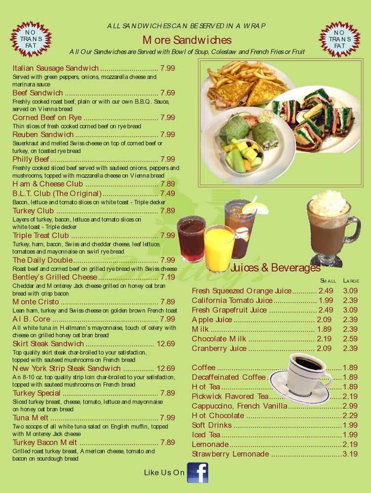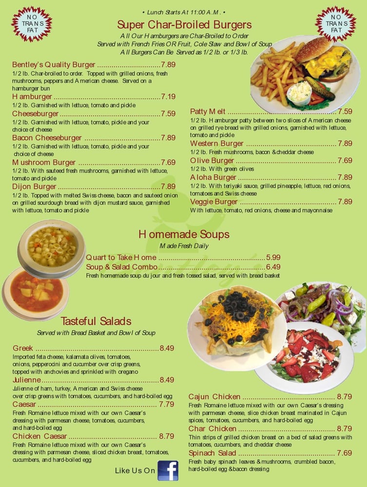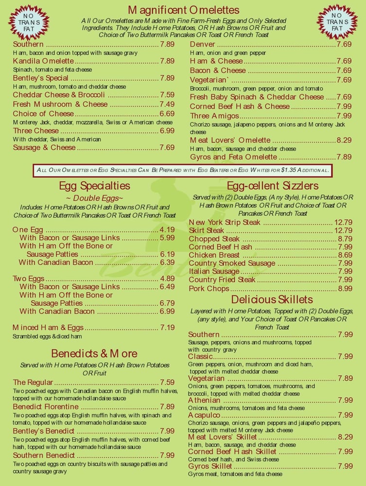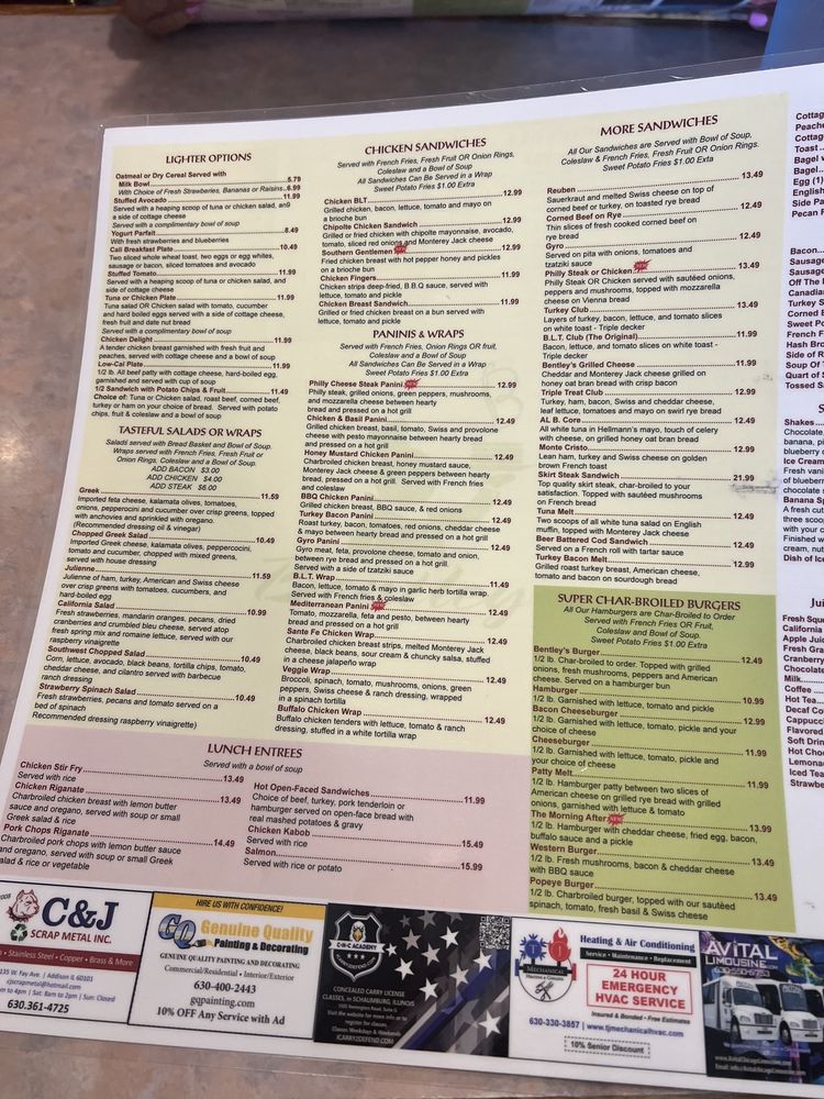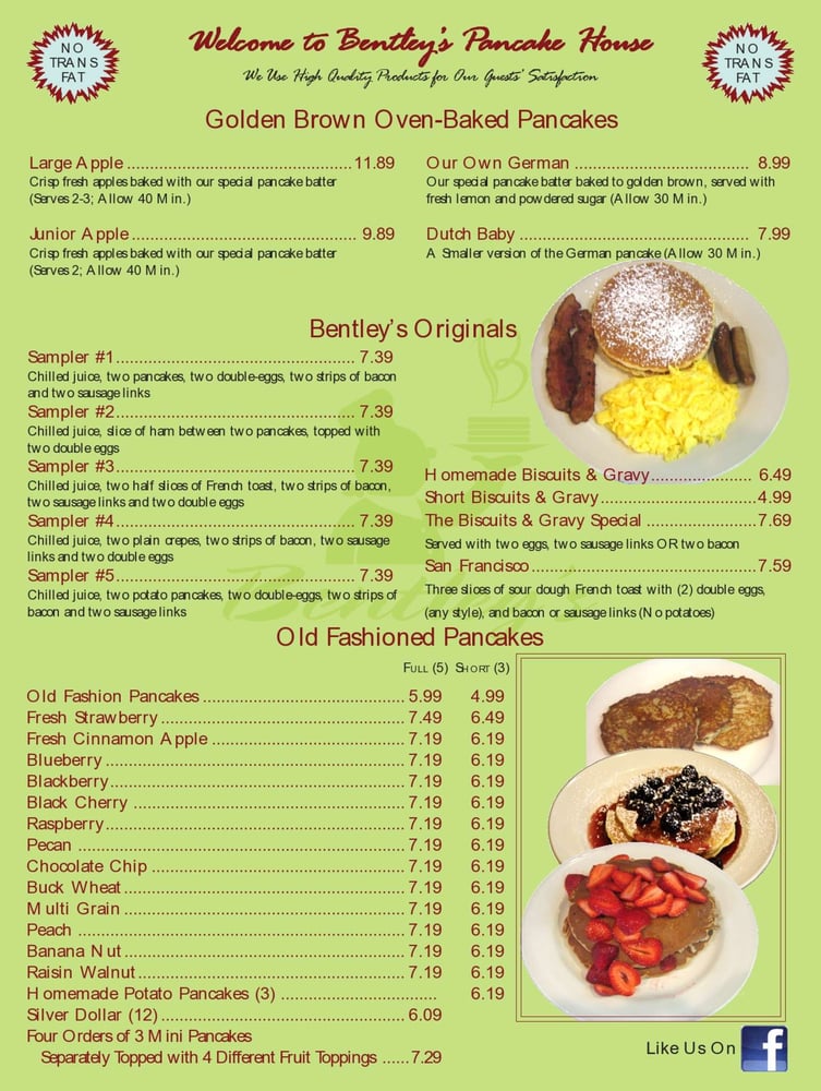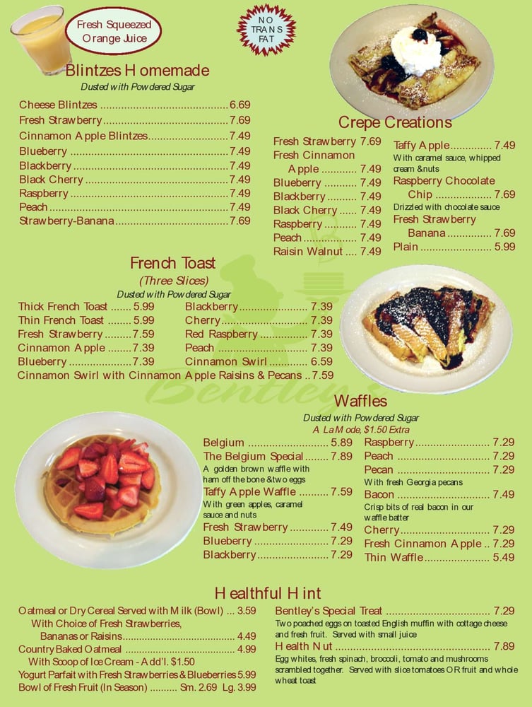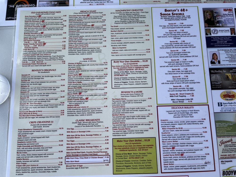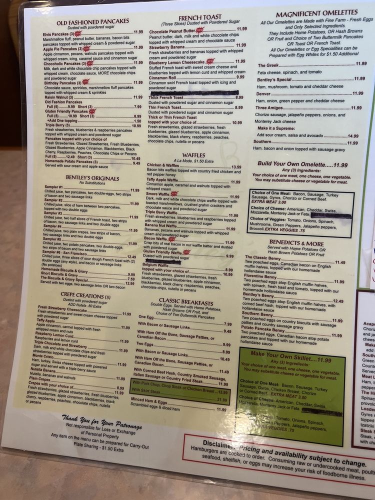 Introducing Bentley's Pancake House, a beloved American eatery in Bloomingdale, IL. This casual dining spot offers a range of amenities like delivery, takeout, and free Wi-Fi. The menu features Bentley's Originals with must-try options like Sampler #1 with pancakes, eggs, bacon, and sausage. Indulge in the Old Fashioned Pancakes like the Elvis Pancakes or Apple Pie Pancakes for a unique twist. Don't miss out on the Crepe Creations with flavors like Fresh Strawberry Cheesecake or Taffy Apple. The cozy atmosphere, great for groups and families, is complemented by the friendly service. Bentley's Pancake House is a go-to spot for delicious breakfast, brunch, or lunch options. Overall, expect a satisfying dining experience with tasty dishes that are sure to leave you craving more.