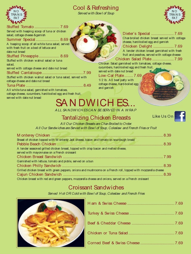Tuna Salad or Chicken Salad with tomato, cucumber and hard boiled eggs served with a side of cottage cheese, fresh fruit and date nut bread. Served with a complimentary bowl of soup